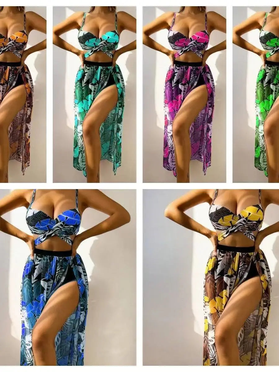 2025 New Sexy 3 Piece Bikini Set Black Push Up Bikini with Leaf Print, Low Waist Bottoms & Skirt Women's Swimsuit