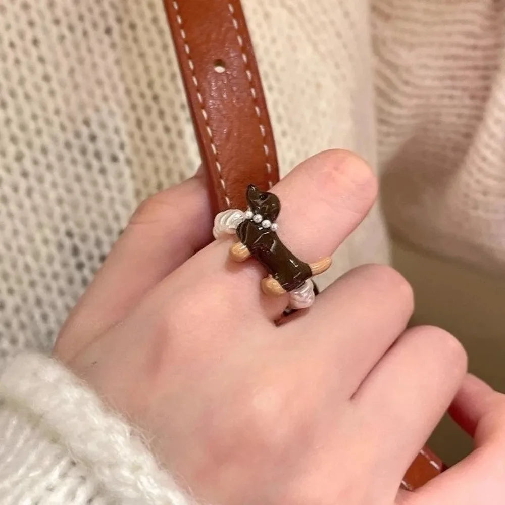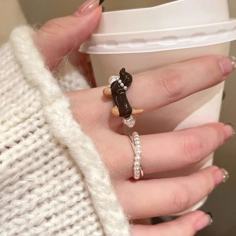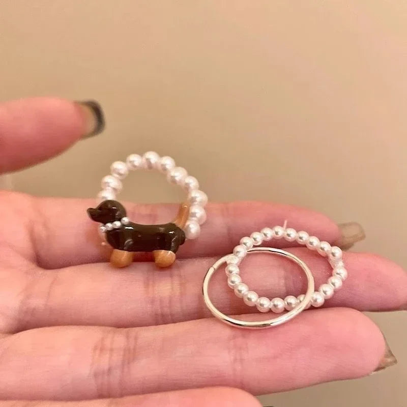 Delicate Puppy Pearl Rings for Women Girls Cute Cartoon Imitation Pearl Bead Ring Set Fashion Jewelry Accessories Student Gifts
