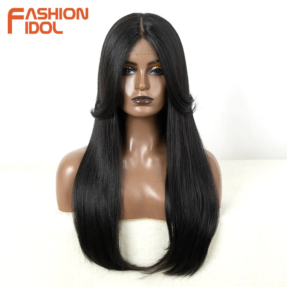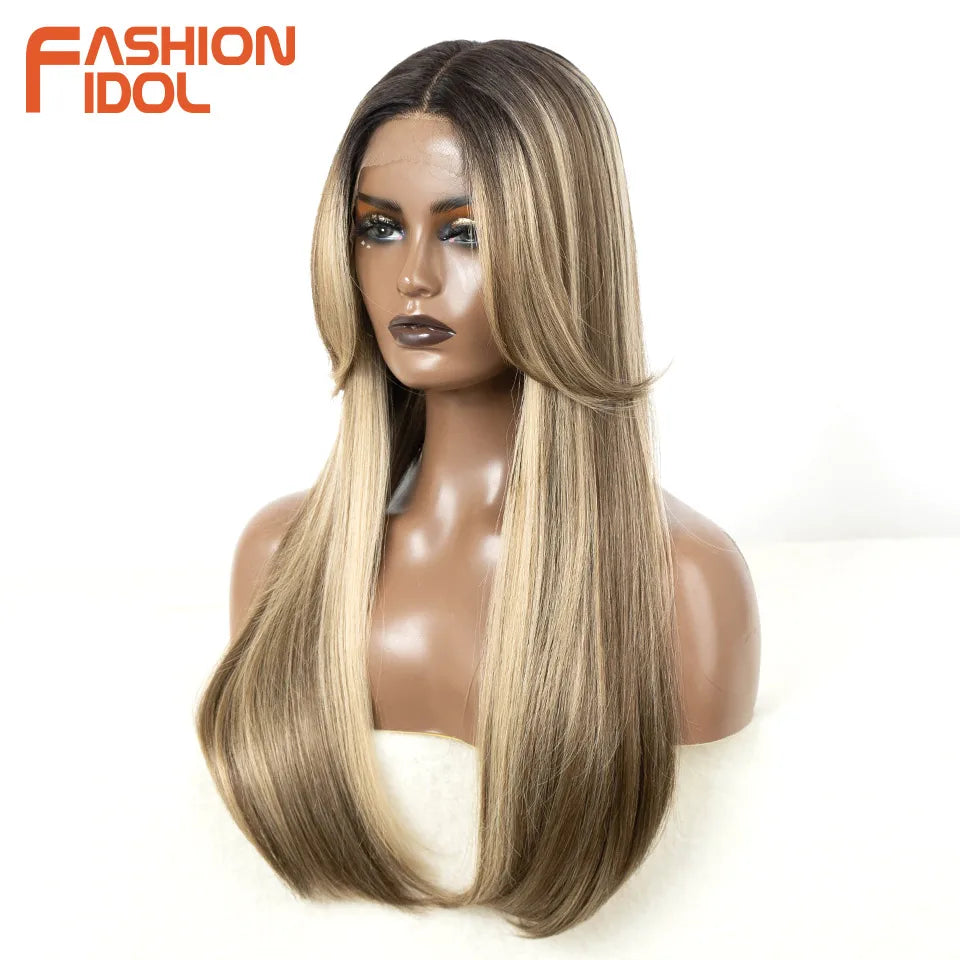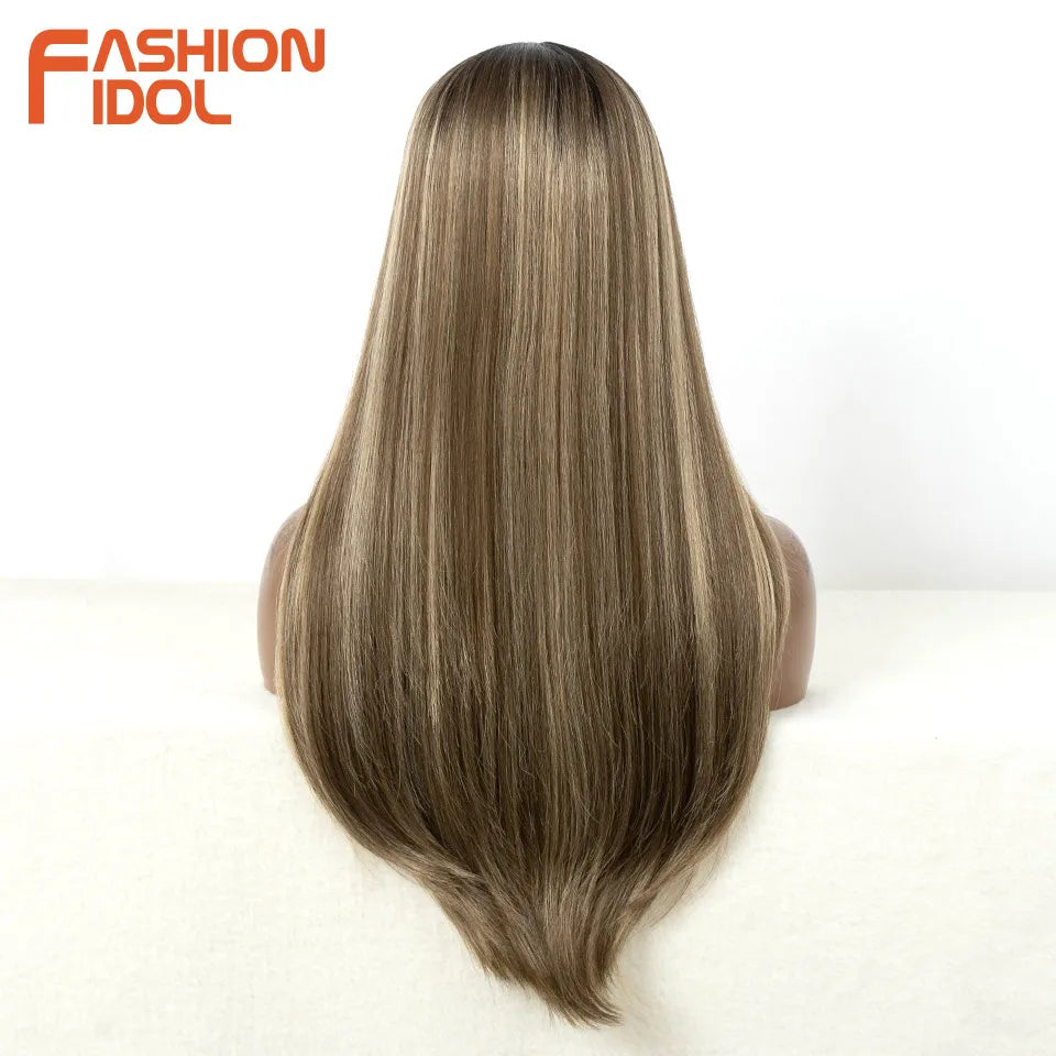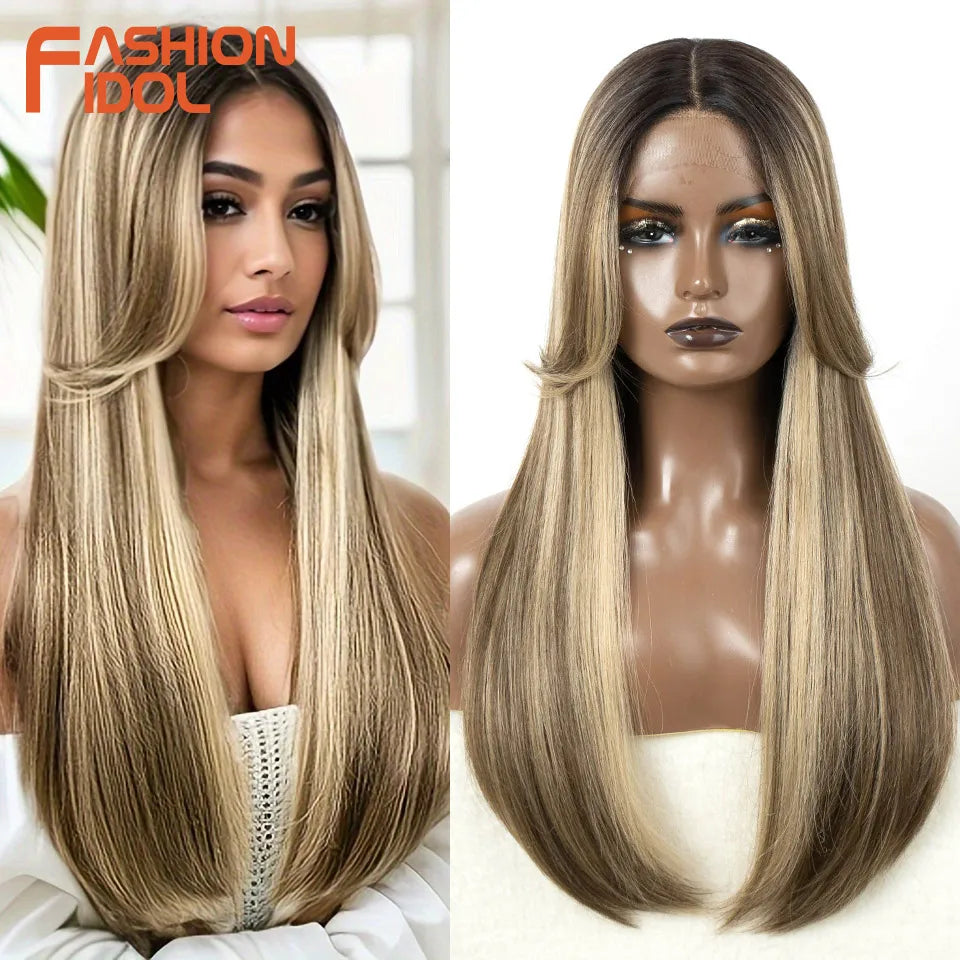 FASHION IDOL Cosplay Wig Synthetic With Bangs Lace Front Wigs For Women Ombre Brown 24 Inch Highlight Glueless Straight Lace Wig