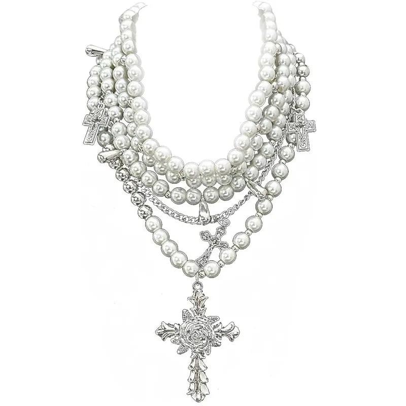 Layered Pearl Necklace for Women Gothic Cross Pearl Stacked Statement Pendant Necklace for Mom Girls Wedding Party Jewerly