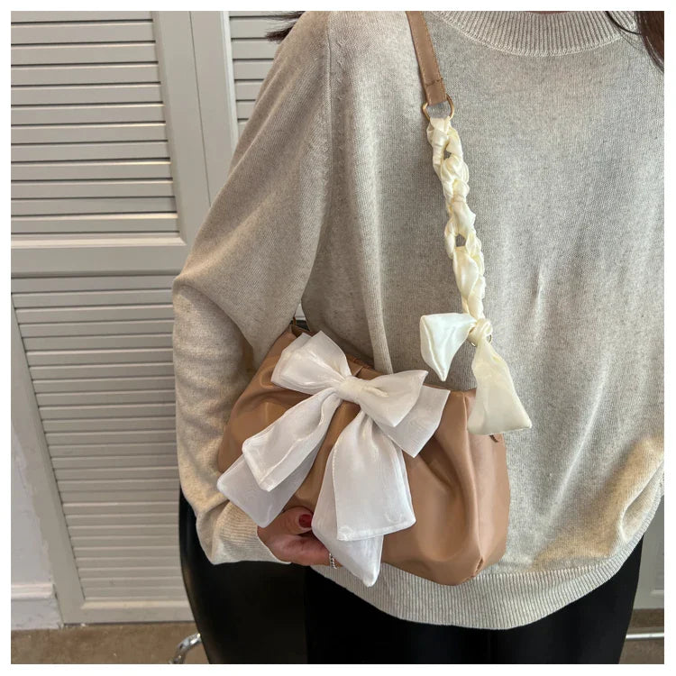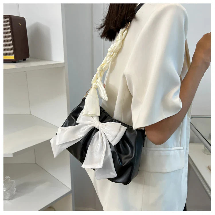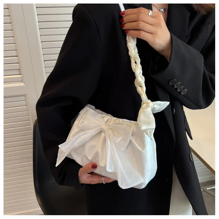 Lovely Bow Handbags for Girls Ladies Fashion Pleated Shoulder Bags for Women Simple Design Female Underarm Bag Casual Tote Purse