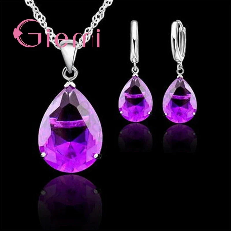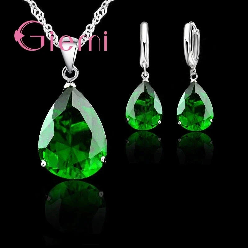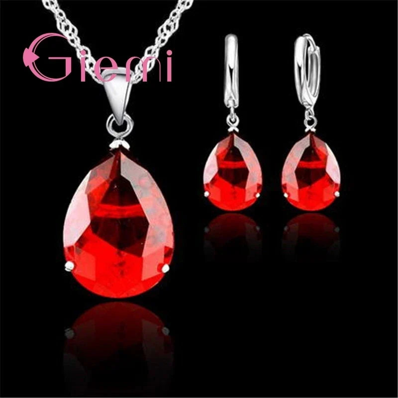 Luxury Drop Shape Large Red Crystal Stone Necklace Earrings 925 Sterling Silver and CZ Wedding Ceremony Jewellery Set