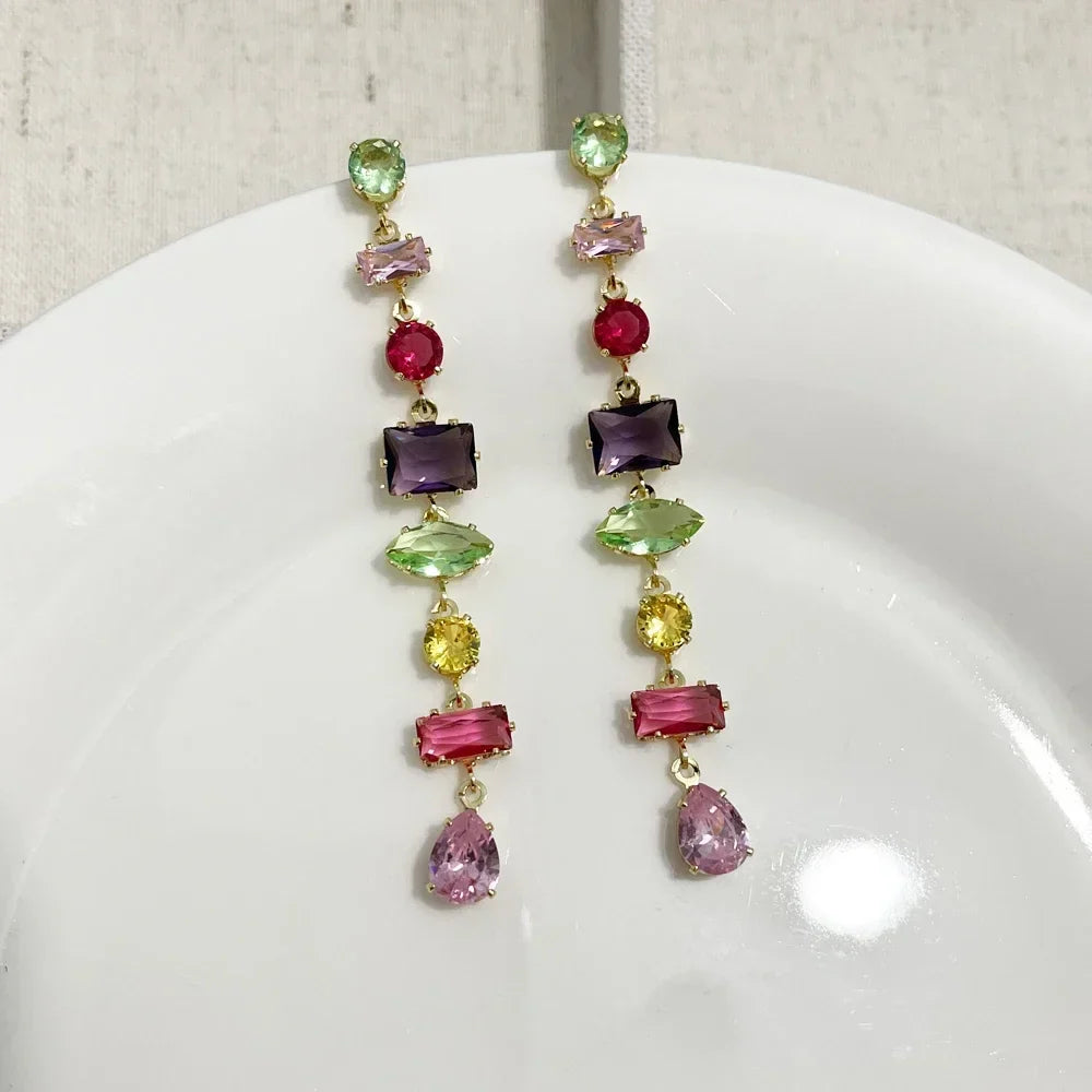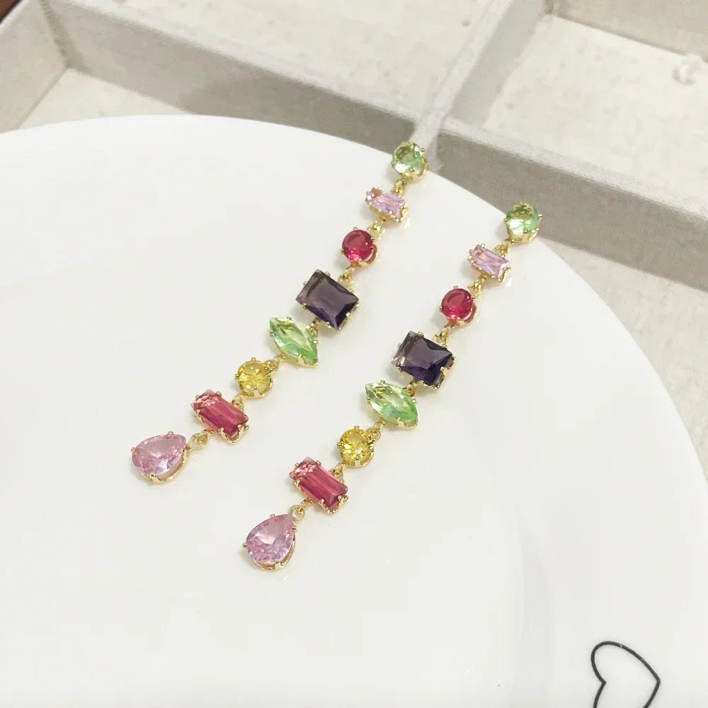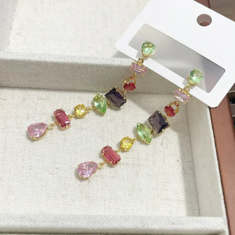 Luxury Rainbow Crystal Dangle Drop Earrings for Women Wedding Party Jewelry Accessories Gorgeous Cubic Zirconia Bridal Brincos