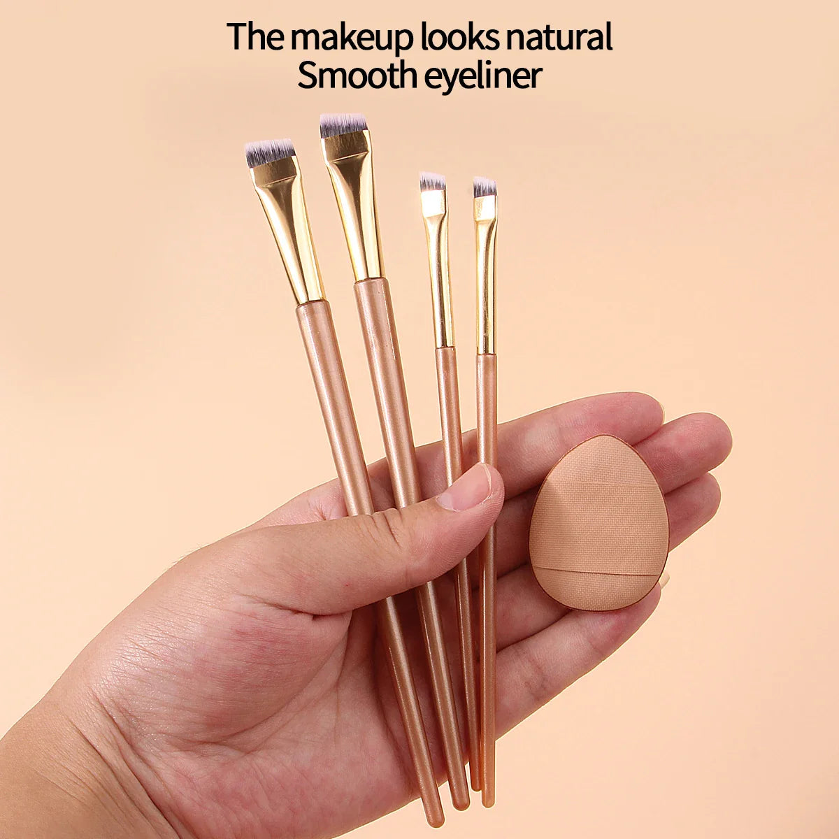 Makeup brush set: ultra-fine eyeliner brush + slanting eyebrow brush + under-eyelid to under-eye brush with mini powder puff