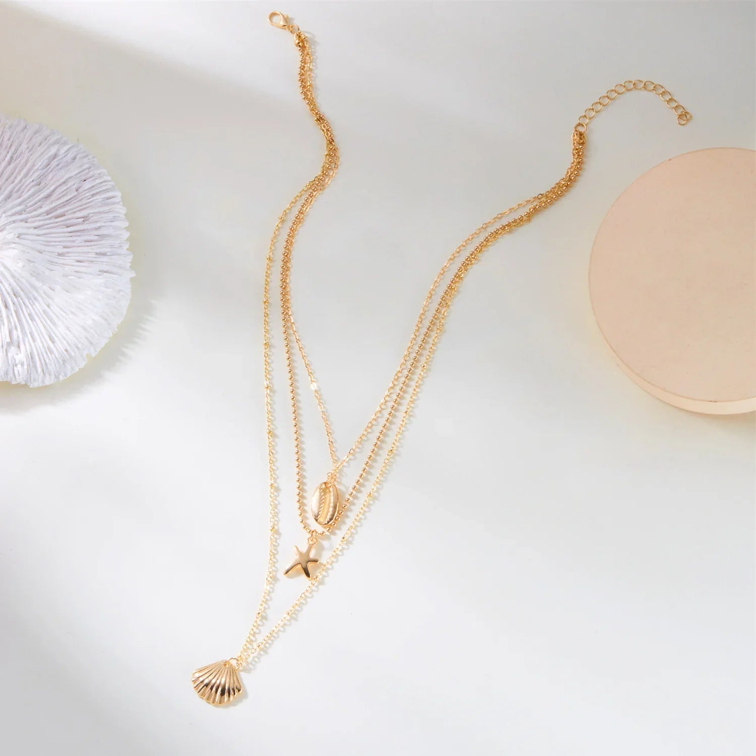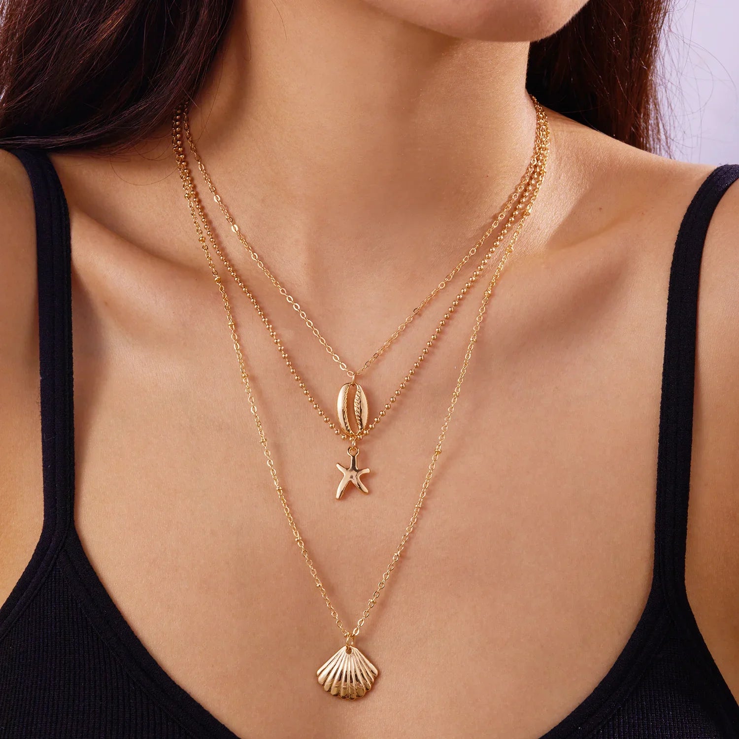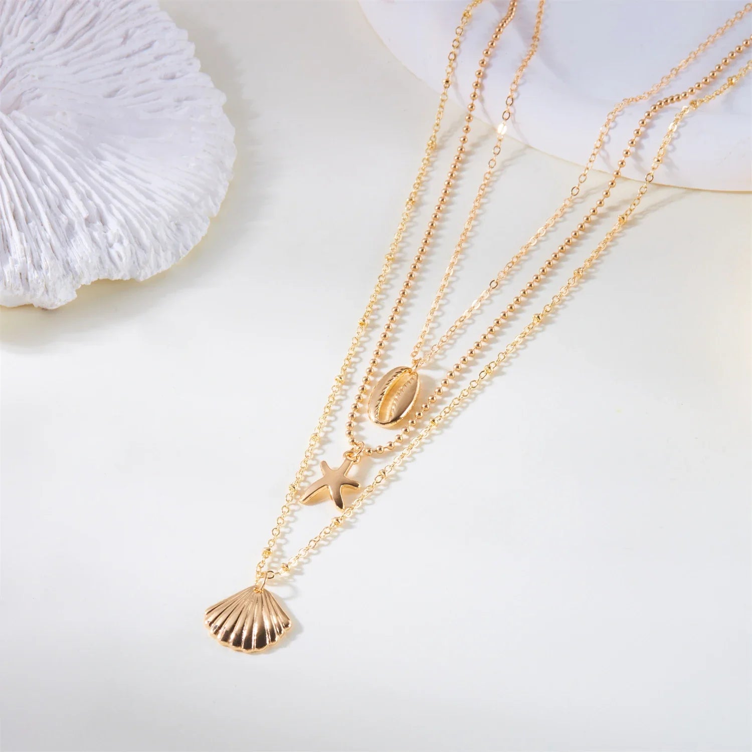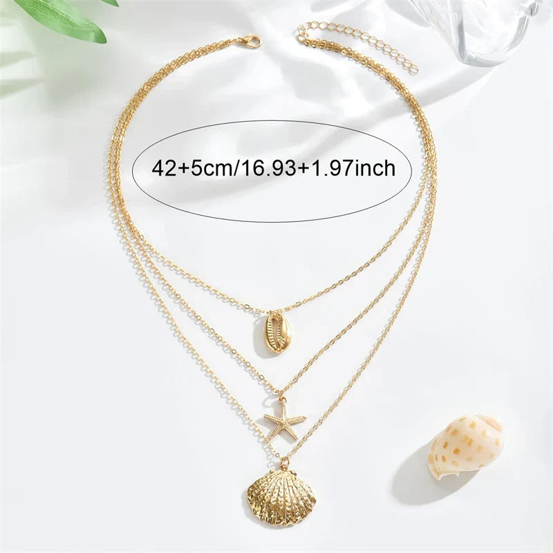 Simple Layered Pendant Necklace for Women Vintage Metal Starfish Sea Shell Multi layer Necklaces Vacation Ocean Style Jewelry