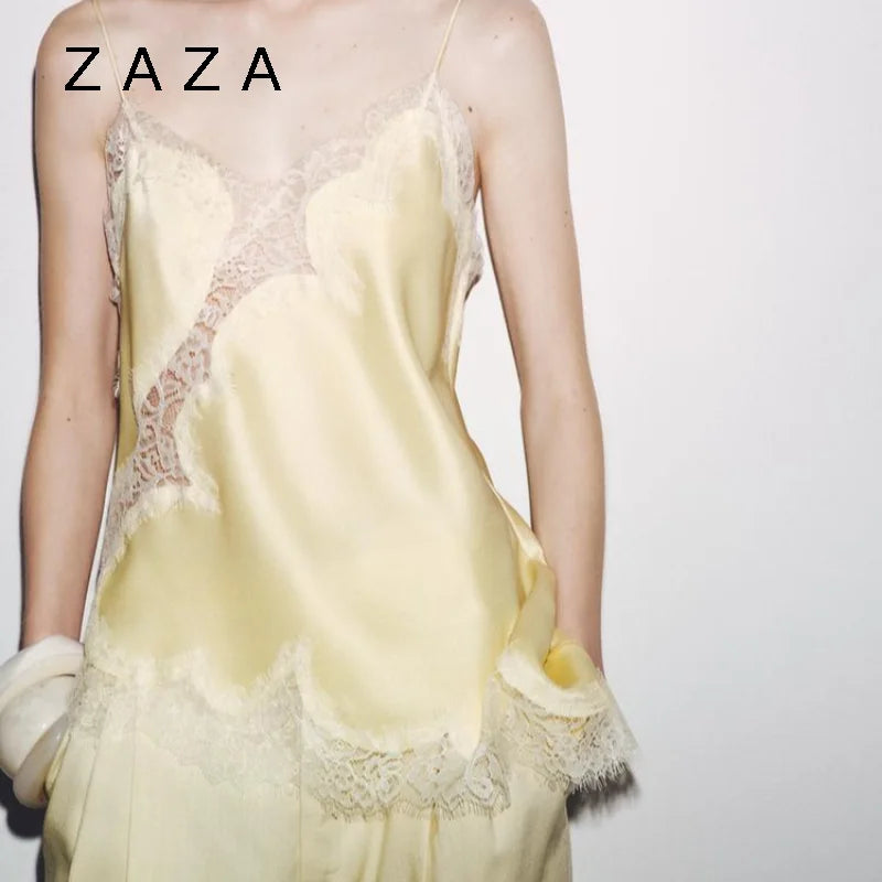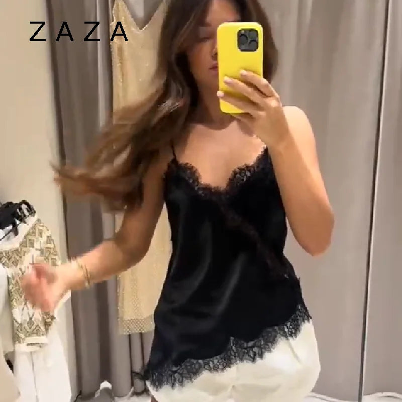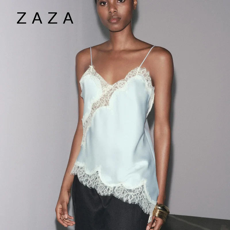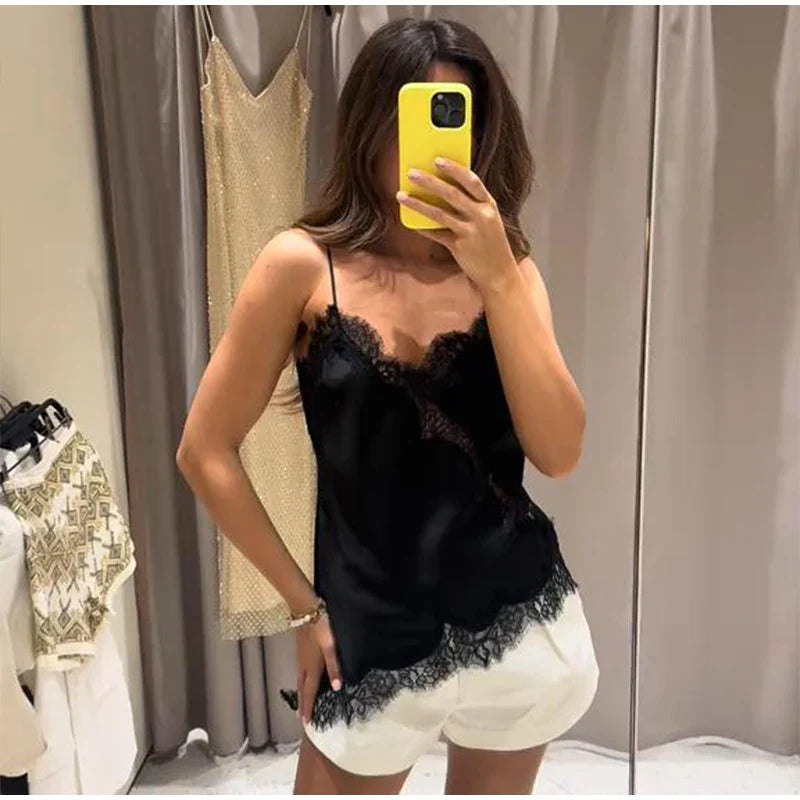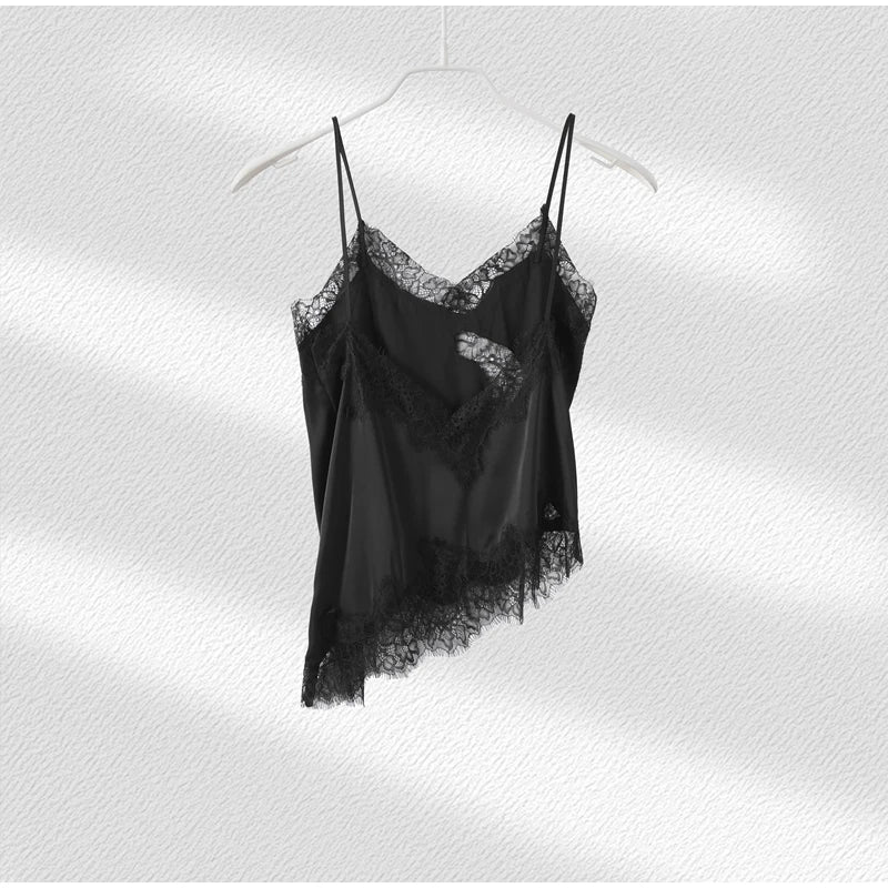 Summer Women Halter Top Satin Lace Spliced Tank Backless Deep Neck Sexy Vest Irregular Hem Vestidos 2025 Lady Vacation Sexy Tops