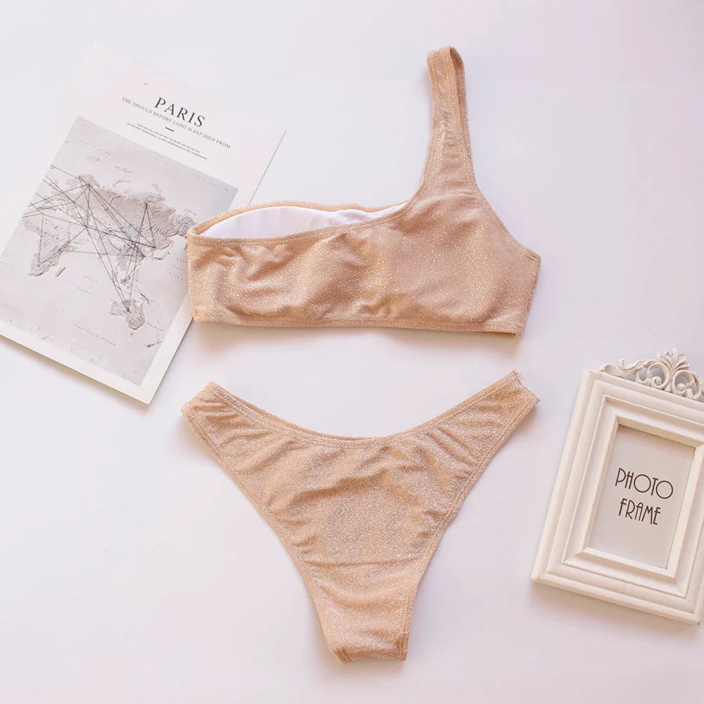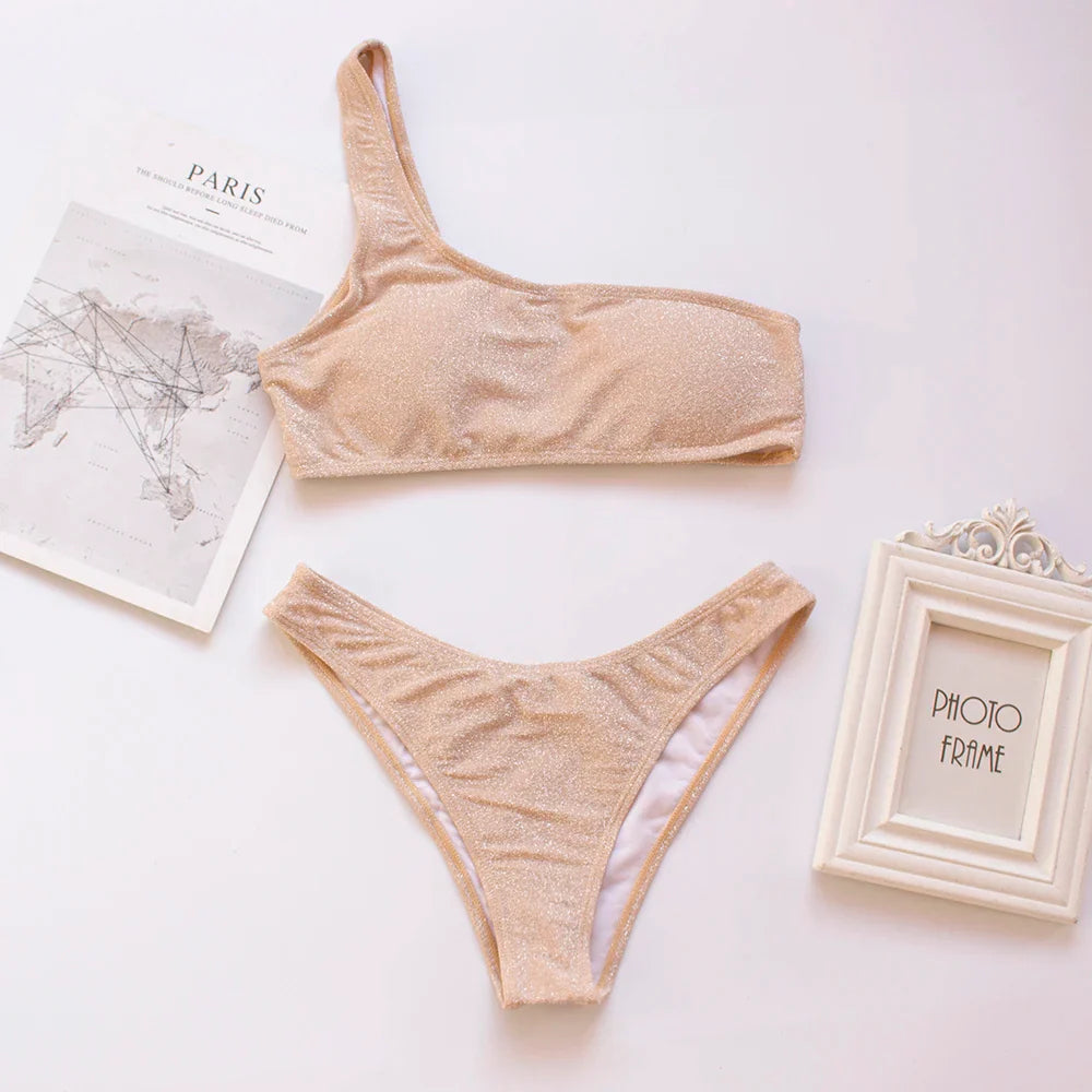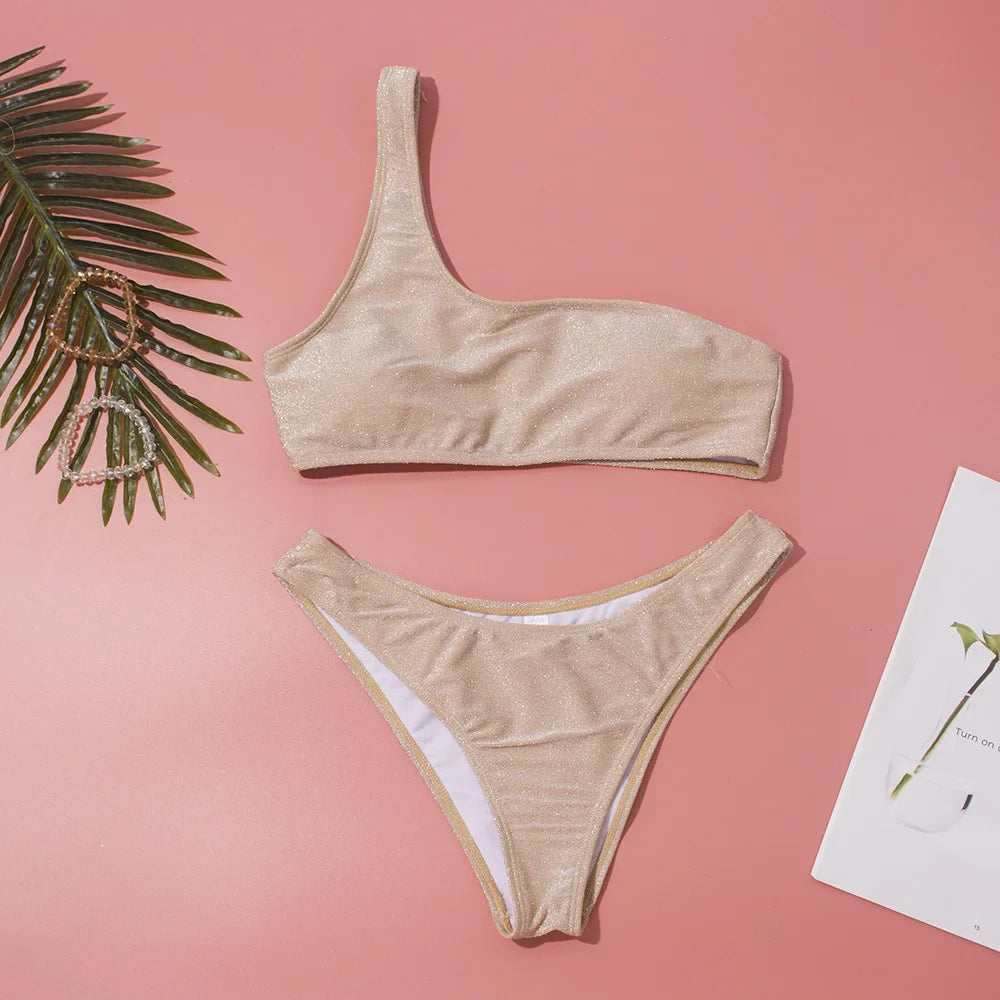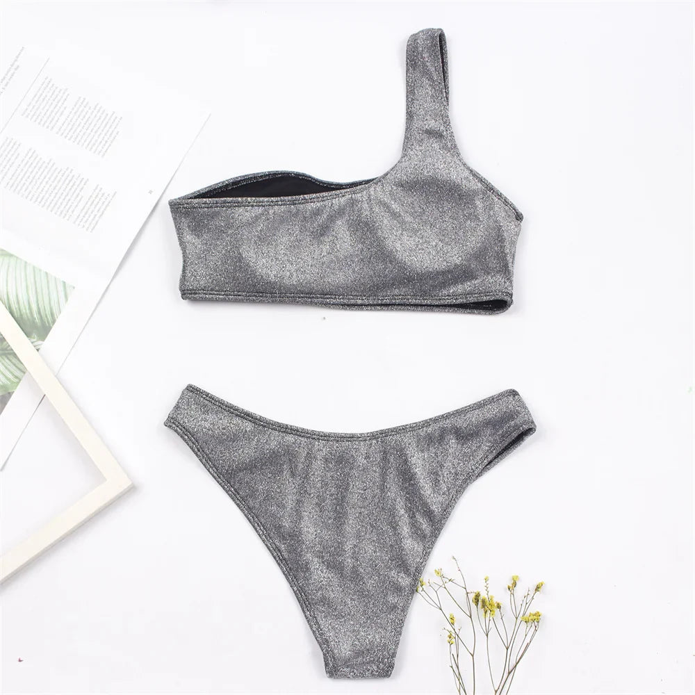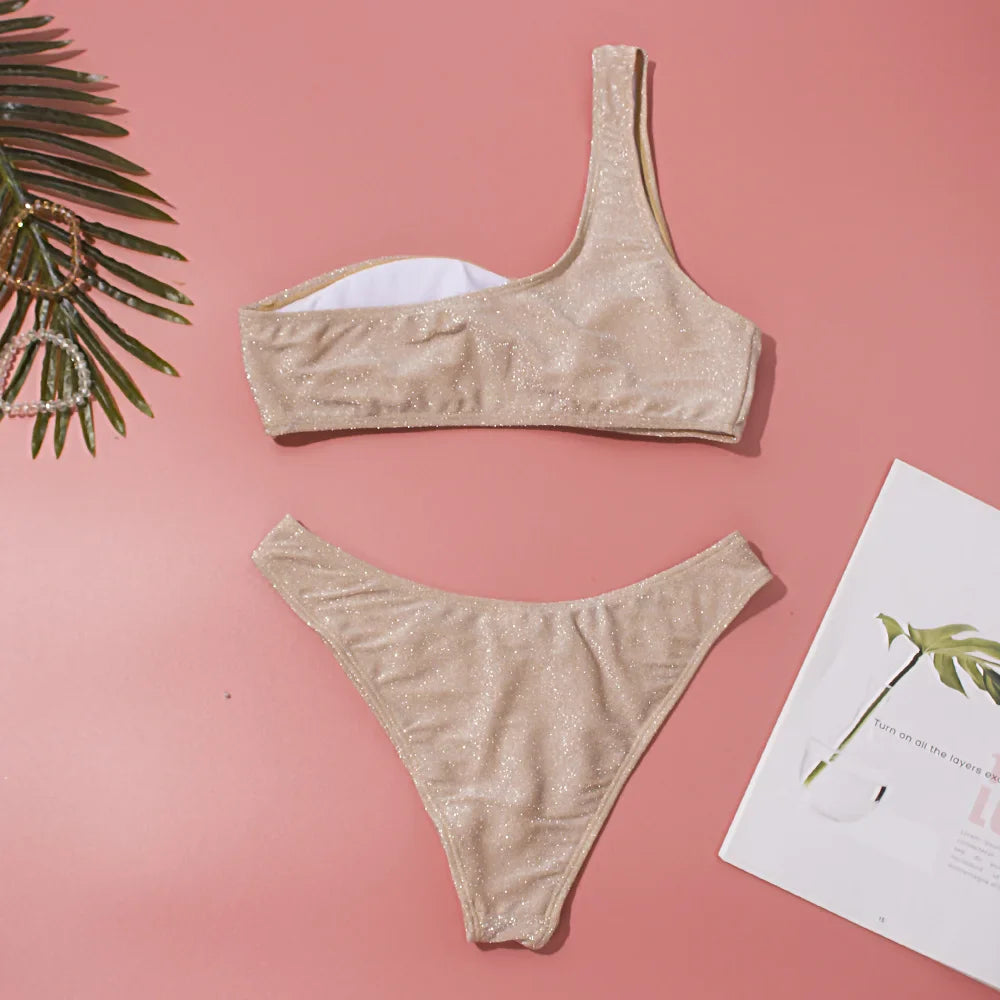 Women Sexy Bikini Set Biquini Ladies One Shoulder Blingbling Swimsuit Female Two Piece Glitter Solid Color SwimwearW2023
