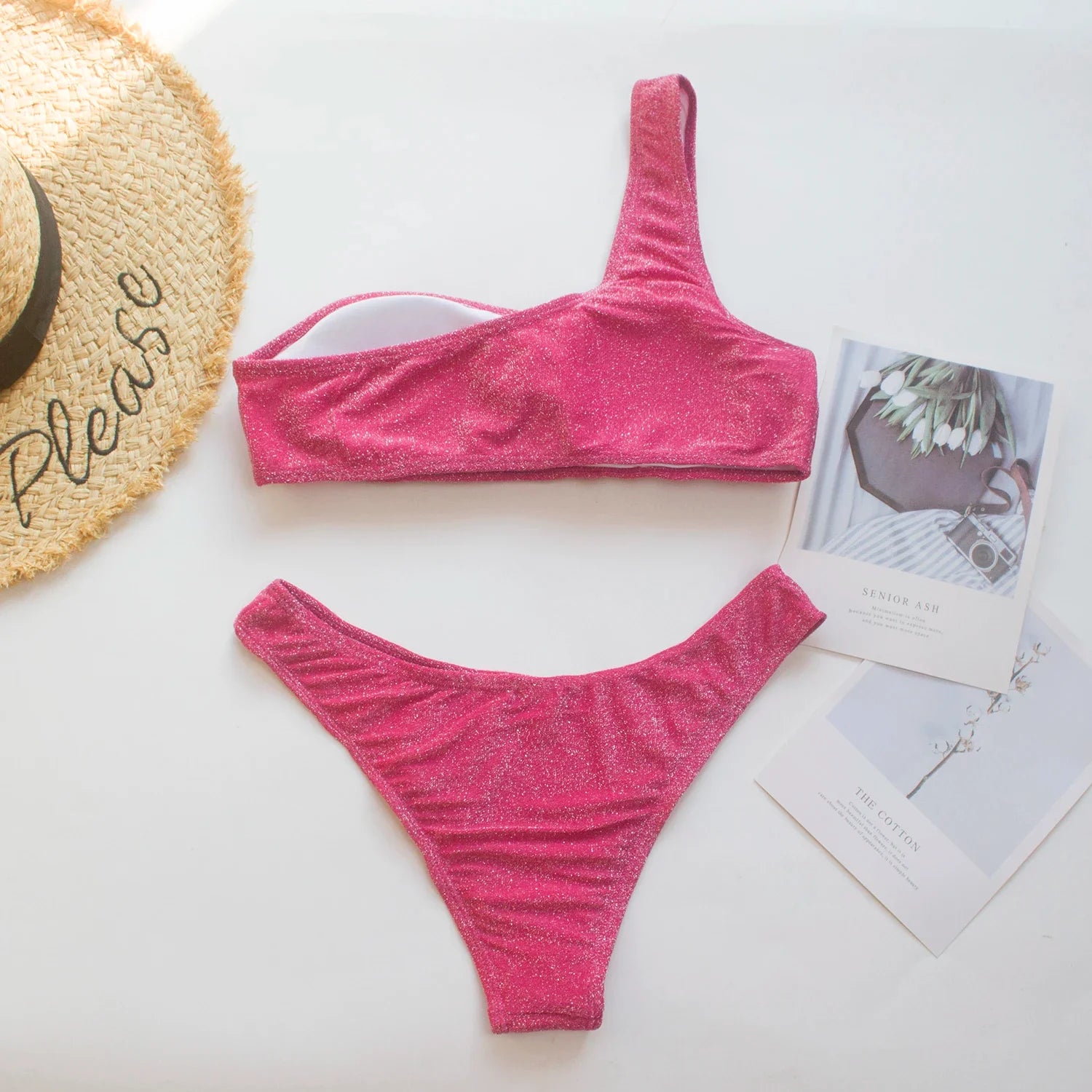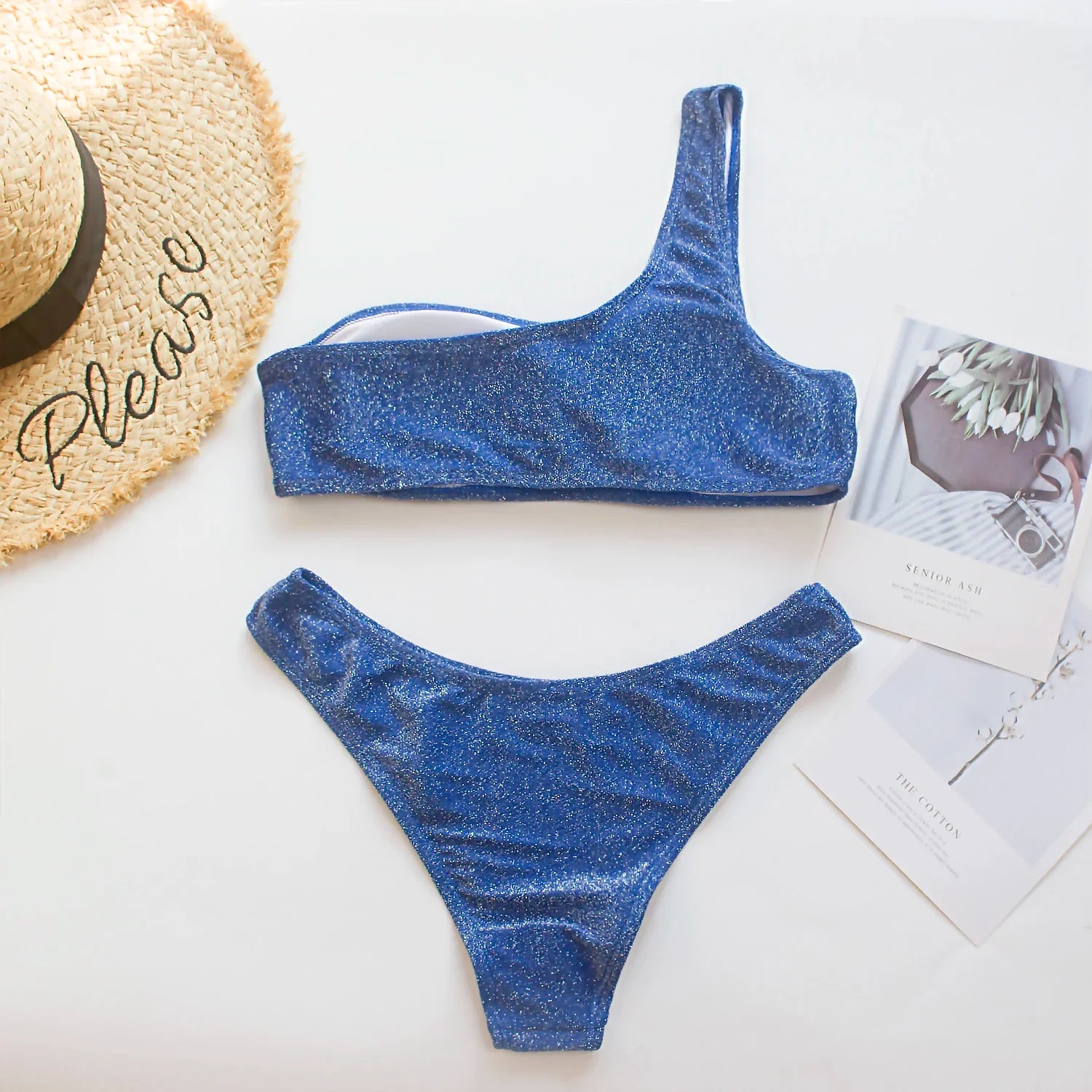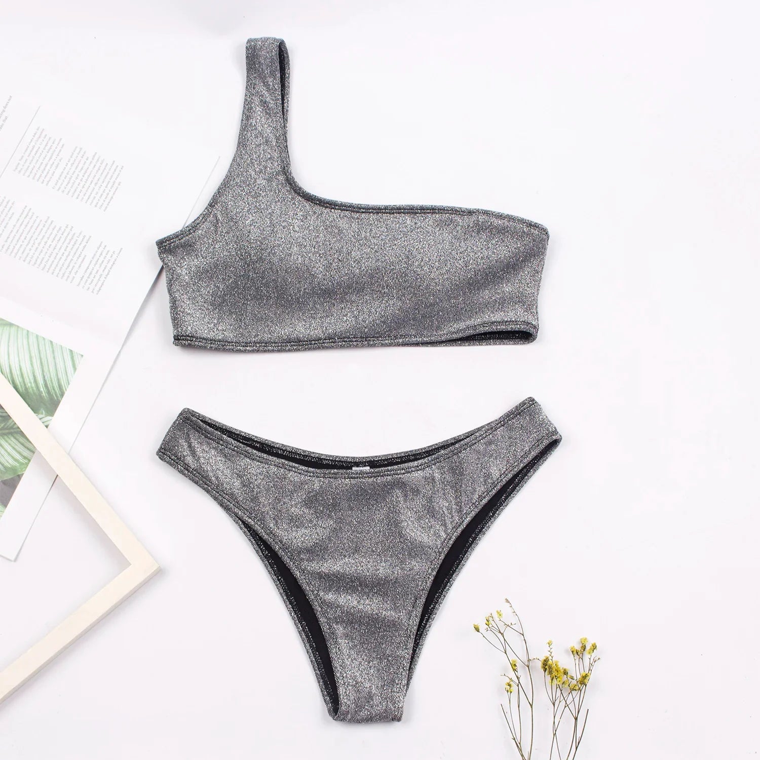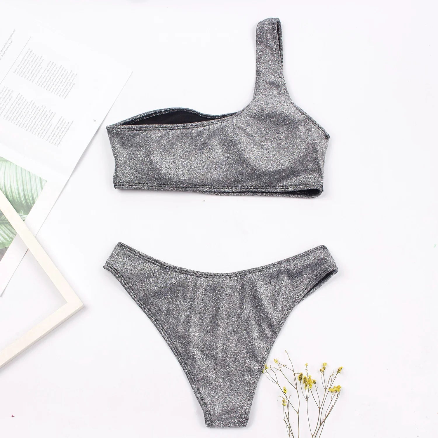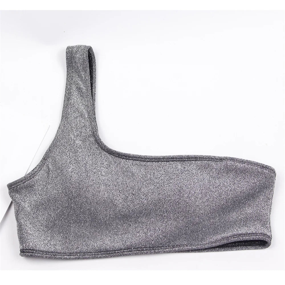 Women Sexy Bikini Set Biquini Ladies One Shoulder Blingbling Swimsuit Female Two Piece Glitter Solid Color SwimwearW2023