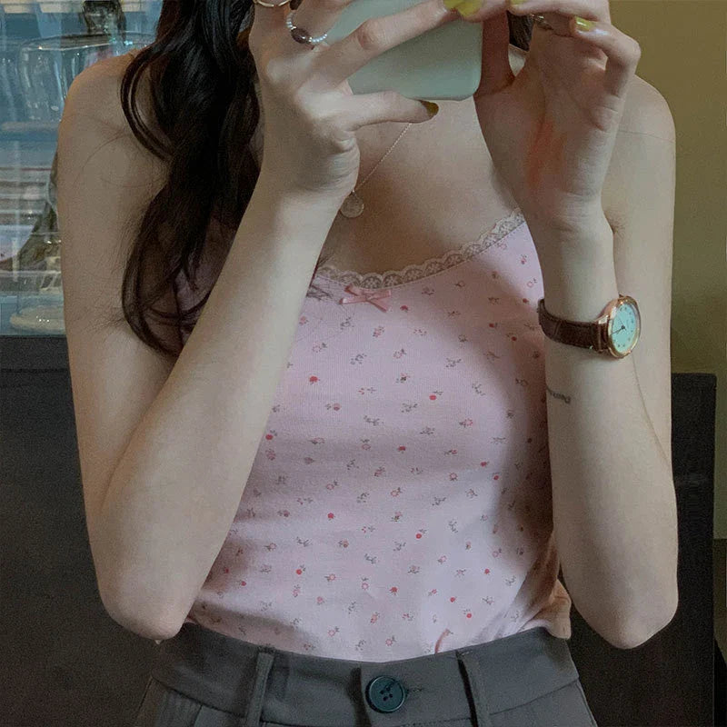Women Tops Summer Girls Tops Short Slim Lace Sweet Print Crop Top Ladies Bottoming Cute Tops Top Mujer Top Femme